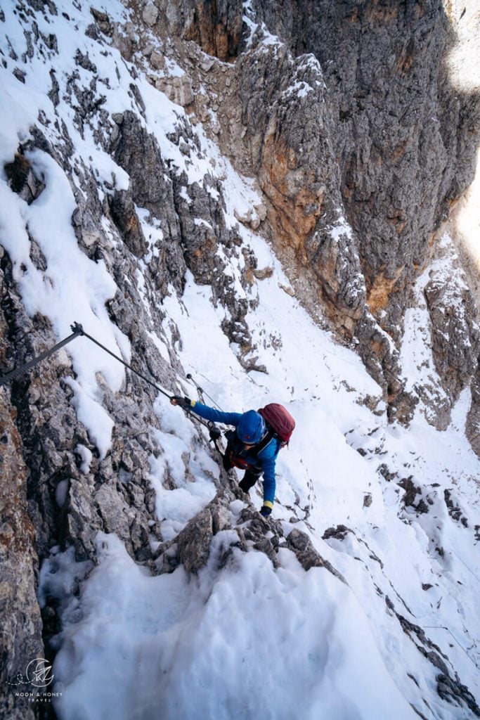 October is also promising, but there’s more likelihood of snow sticking later in the season, because the via ferrata is exposed to minimal sunlight in Autumn.