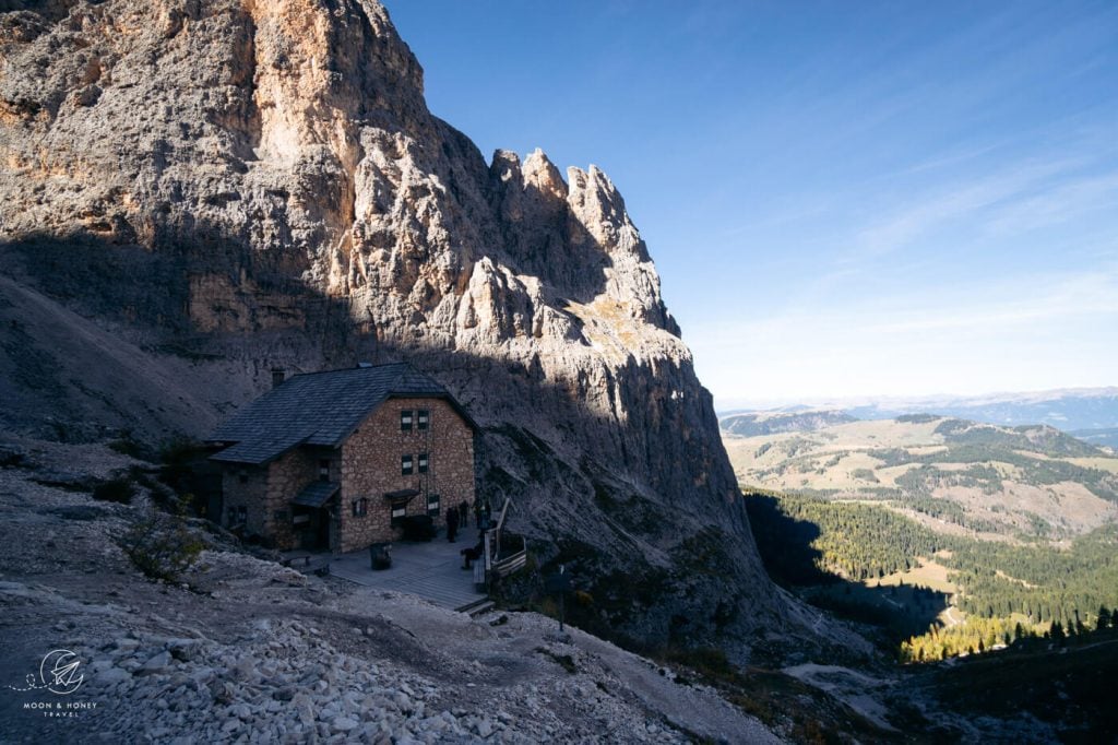 The gondola mountain station is located directly on the Sassolungo saddle, next to Rifugio Demetz. There’s a restroom inside the mountain hut should you need one (1 EUR).