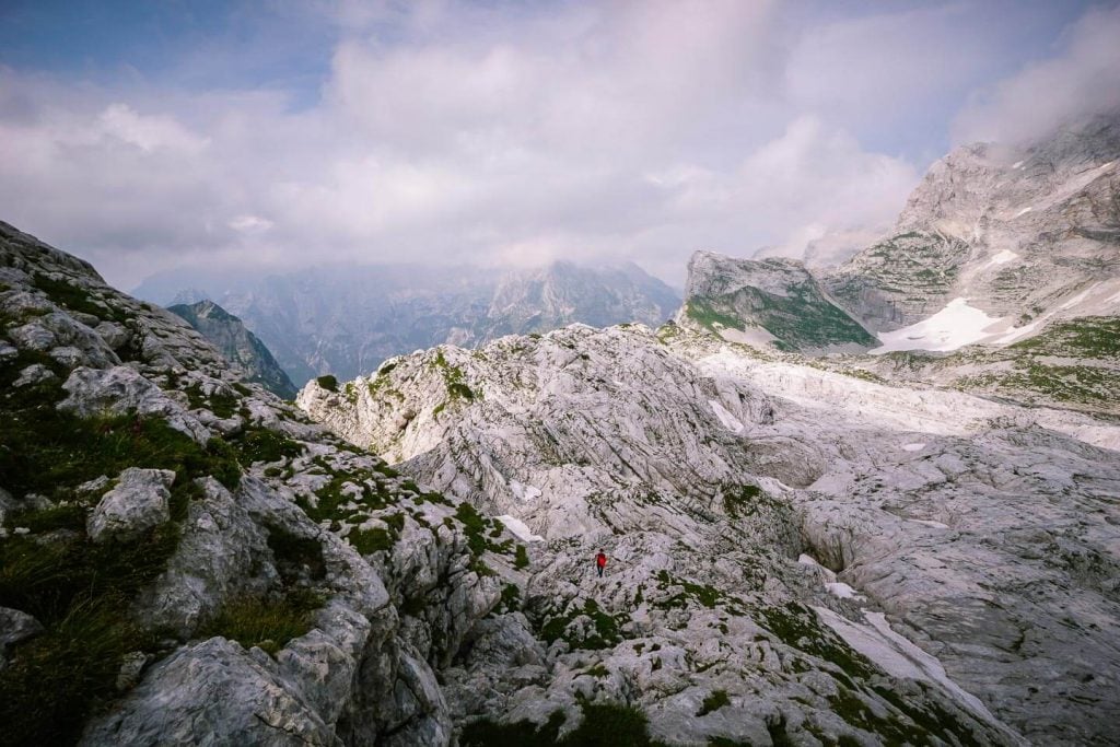 Eventually, you’ll descend the ridge and cross a sea of karst pavement to Zasavska koča na Prehodavcih.