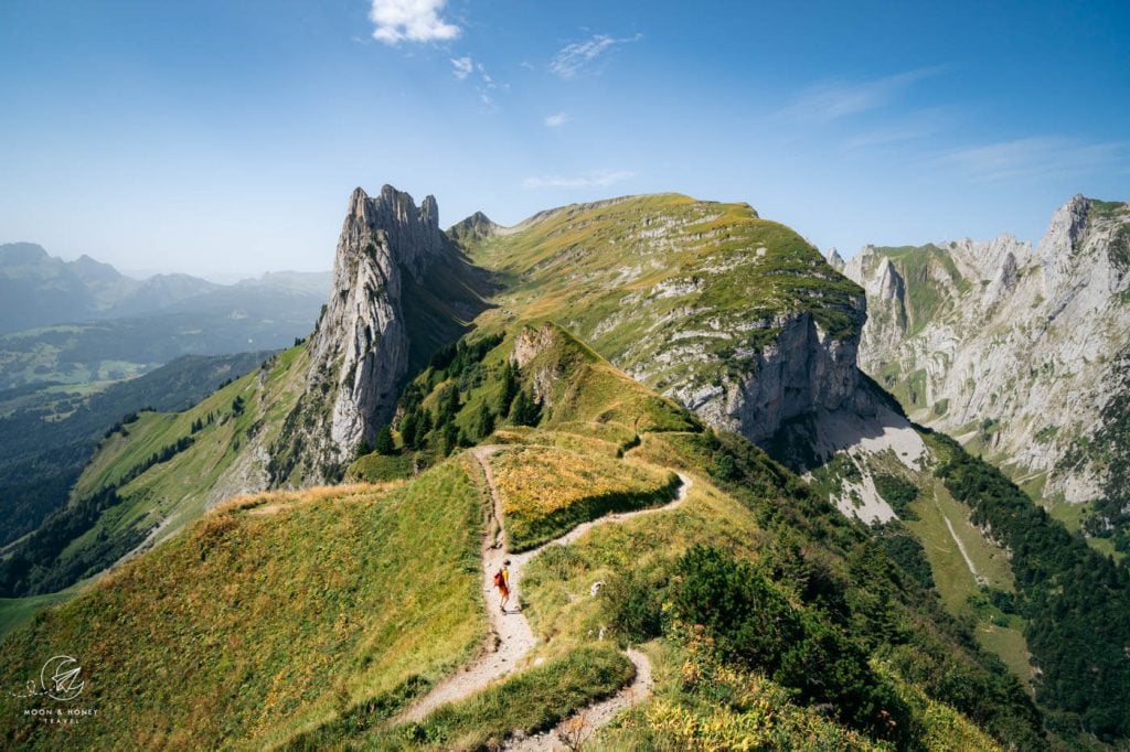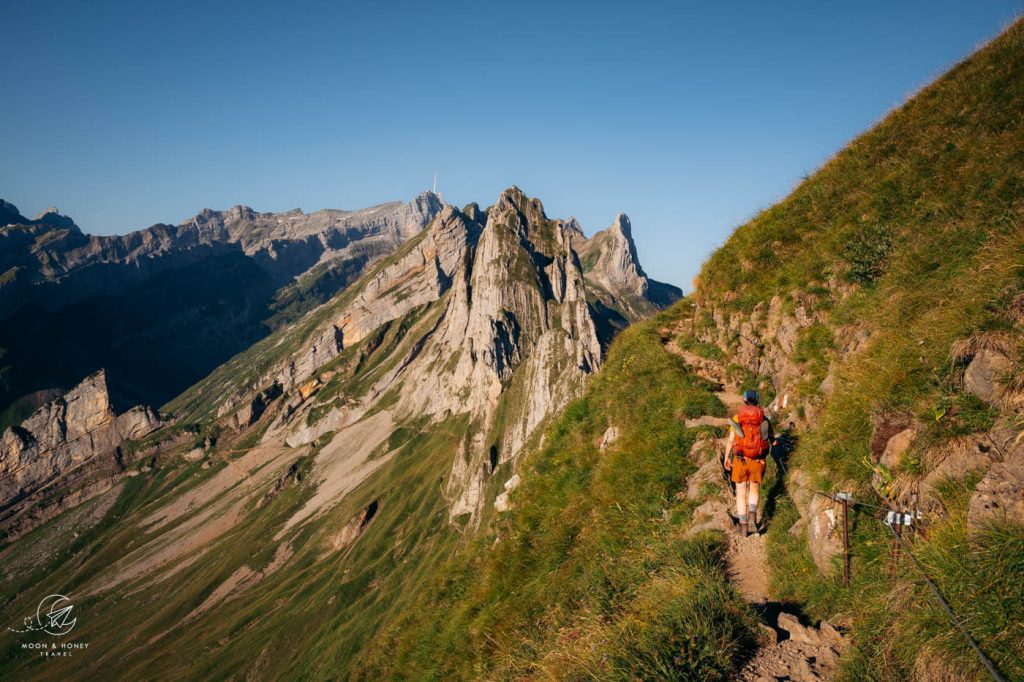 The ridge is an absolute joy to hike. You’ll see Widderalpstöck (2058 m), Hundstein (2157 m), Altmann (2435 m), Ebenalp (1640 m), Schäfler (1924 m), and many more peaks.