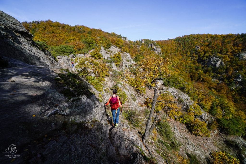 The trail continues along the treeless flank of the Vogelberg. As you hike beneath the rock towers, the trail narrows and is secured with fixed cables.