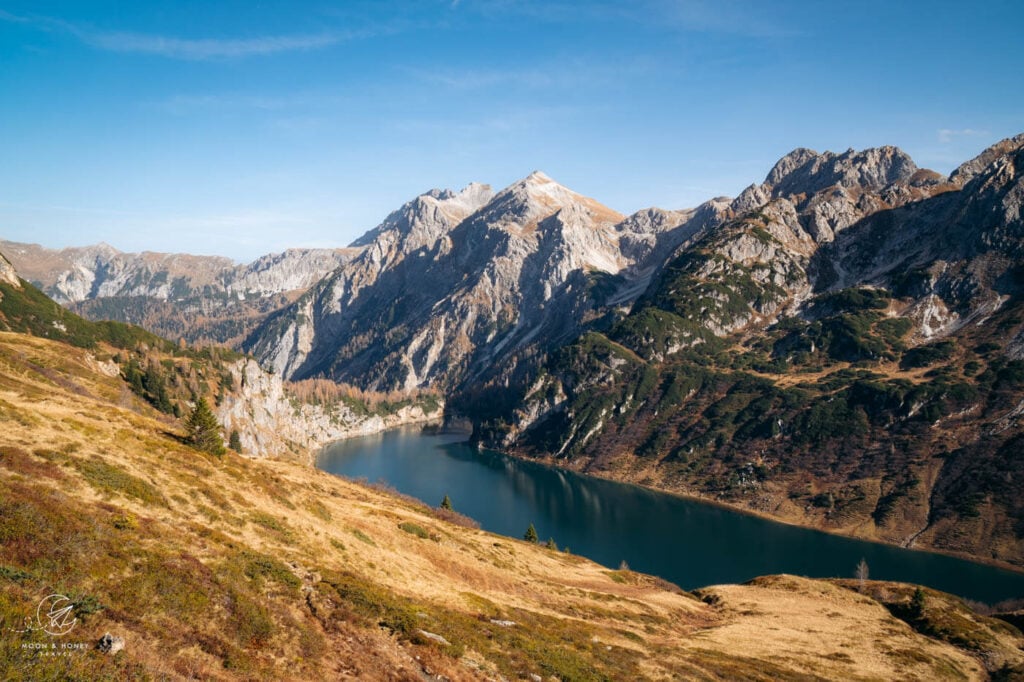 After climbing up to Tappenkarsee, we recommend extending the hike to the Draugsteintörl saddle. This extended circuit is the highlight of the tour, because it affords wonderful and ever-changing vistas of the lake.
