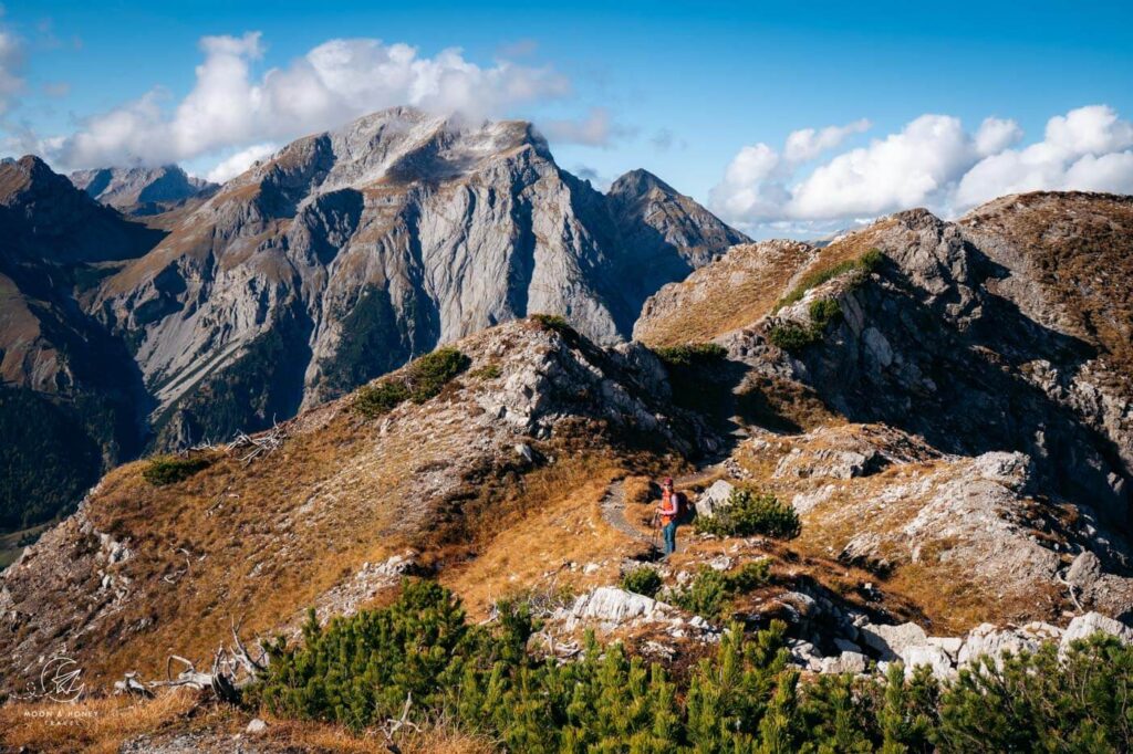 While Lamsenjoch Hut is certainly special, the highlight of this Karwendel day hike is the Hahnkampl ridge trail, which affords bird’s-eye views of both Falzturntal Valley and Grosser Ahornboden. Expect impressive, far-reaching vistas of Sonnjoch, Gamsjoch, and the Hinterautal-Vomper-Kette chain as well.