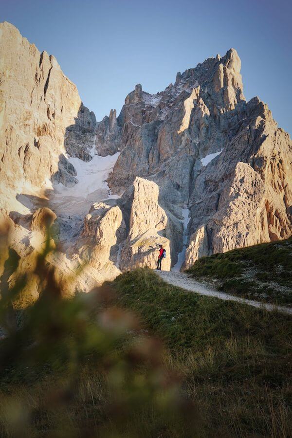 With its pale-colored 3000+ meter peaks, each uniquely beautiful, the Pala Group also looks like a gathering of giants turned to stone. From right to left, you’ll see Cimon della Pala, Cima della Vezzana, Campanile Travignolo, Cima Silvano, Cima dei Bureloni, and Monte Mulaz.