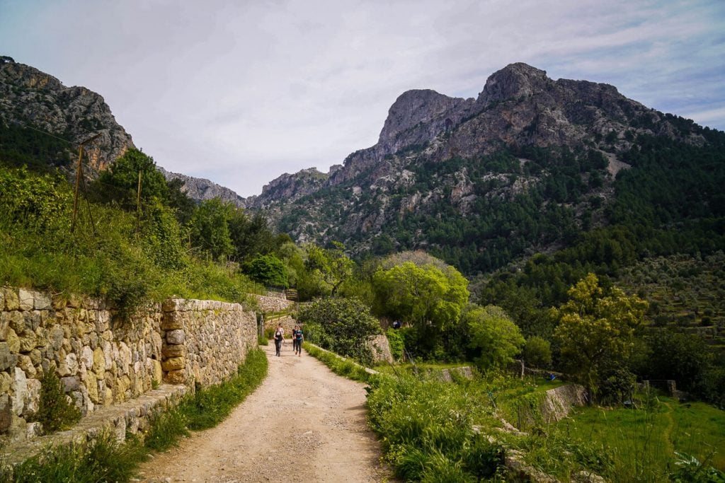 Der Weg führt entlang von Steinmauern in Richtung Berge. Cornador Gran und Cornador Petit sind bereits vor dir zu erkennen. Zu deiner Rechten, hinter ein paar bewirtschafteten Feldern, erstreckt sich Sóller.